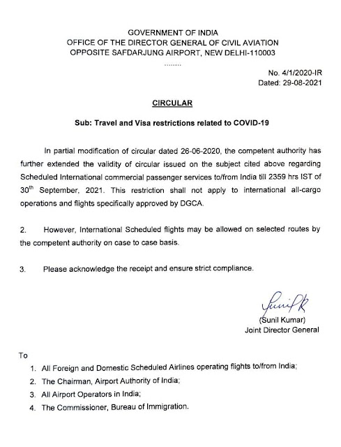 अंतरराष्ट्रीय अनुसूचित वाणिज्यिक उड़ानों पर प्रतिबंध 17 महीने के अंतराल के बाद 31 अगस्त, 2021 को समाप्त होने वाला था। कोरोना वायरस महामारी के कारण 23 मार्च, 2020 से भारत में अंतर्राष्ट्रीय उड़ानें निलंबित हैं।