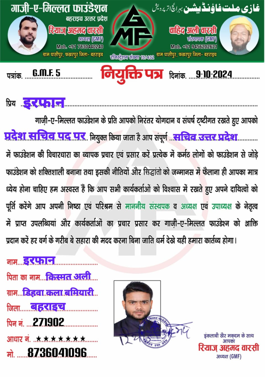 बहराइच, 9 अक्टूबर 2024: गाज़ी ए मिल्लत फाउंडेशन के संगठन का विस्तार तेजी से हो रहा है, और इसी कड़ी में तीन नए पदाधिकारियों को जिम्मेदारियां सौंपी गई हैं। इरफ़ान सलमानी को प्रदेश सचिव के रूप में नियुक्त किया गया है, जबकि मोहम्मद सलमान मंसूरी को बहराइच जिले का सोशल मीडिया प्रभारी बनाया गया है। मसूद रजा को जिला कार्यकरणी सदस्य के रूप में नियुक्त किया गया है, जिससे संगठन के विस्तार में और तेजी आएगी।