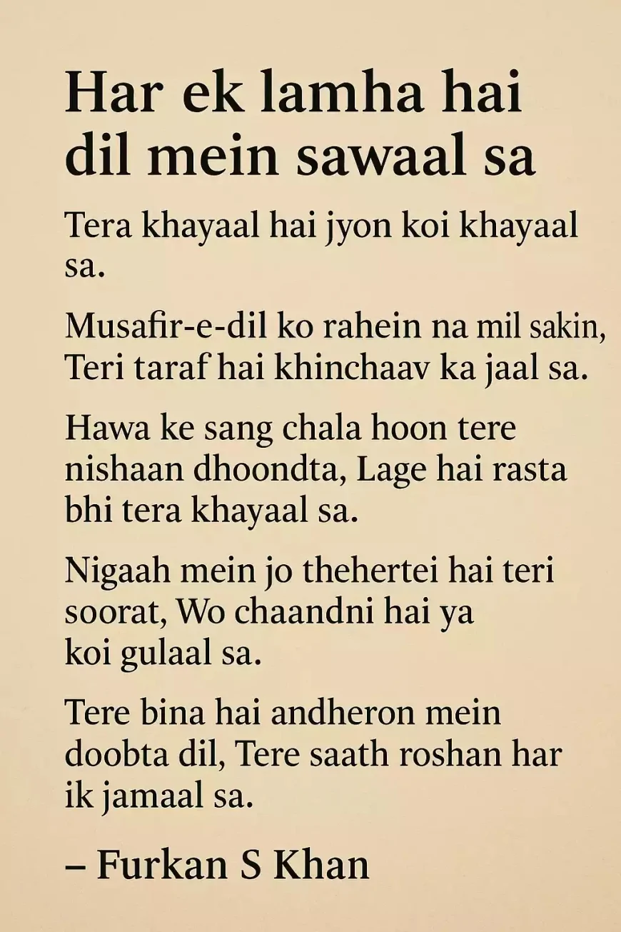 यह ग़ज़ल Furkan S Khan की है जिसमें हर शेर 'सा' रदीफ़ और 'आल' क़ाफ़िया पर आधारित है। इश्क़, ख्याल और जज़्बात के रंगों में डूबी यह शायरी दिल को छू लेने वाली है।