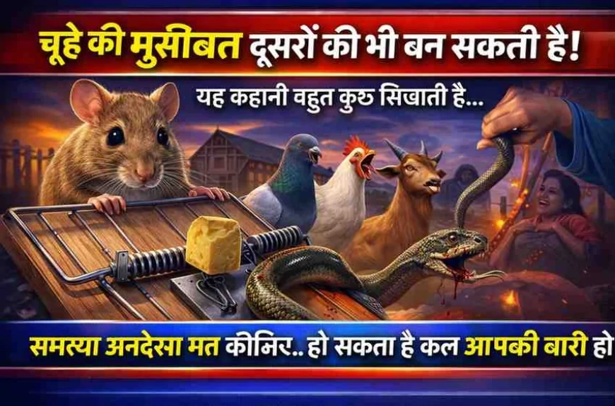 निराश चूहा ये बात मुर्गे को बताने गया.. मुर्गे ने खिल्ली उड़ाते हुए कहा : जा भाई ये मेरी समस्या नहीं है..हताश चूहे ने बाड़े में जा कर बकरे को ये बात बताई… और बकरा हँसते हँसते लोटपोट होने लगा..उसी रात चूहेदानी में खटाक की आवाज़ हुई जिस में एक ज़हरीला साँप फँस गया था...अँधेरे में उसकी पूँछ को चूहा समझ कर उस कसाई की पत्नी ने उसे निकाला और साँप ने उसे डस लिया तबीयत बिगड़ने पर उस व्यक्ति ने हकीम को बुलवाया...